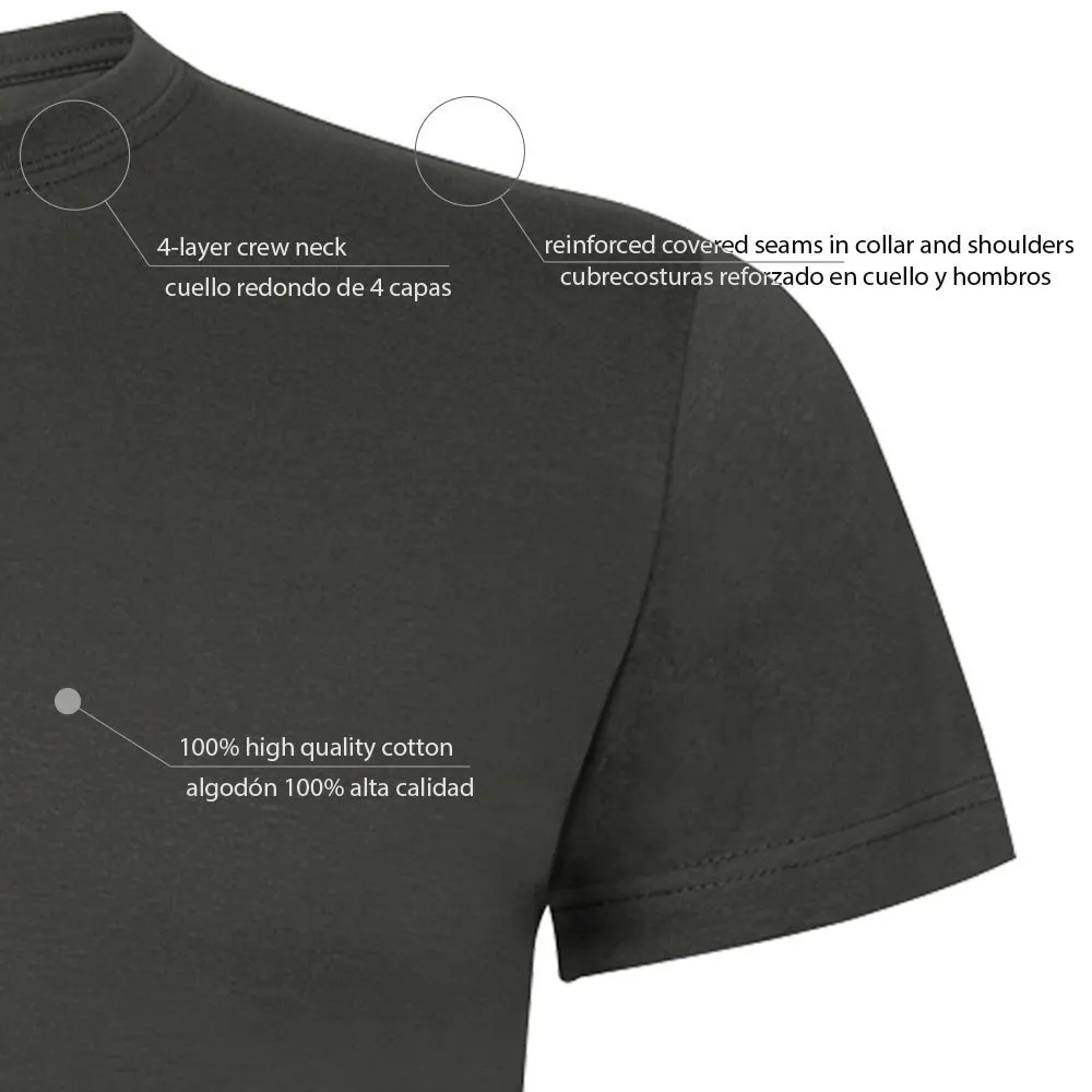 Cuello redondo con 4 capas, cubre costuras reforzado en cuello y hombros y costuras laterales.