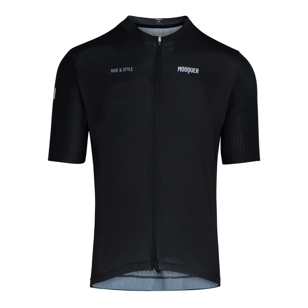 El maillot de ciclismo corto Black Supercorsa está confeccionado con las mejores telas italianas. La gama más alta de nuestra colección, compuesta por un tejido microperforado extrasuave que ayuda a evacuar el calor, permite un secado rápido y una alta transpiración en los días más calurosos. Incorpora la cremallera japonesa YKK Japón con bloqueo automático para evitar que se baje. Cubrecremalleras en el cuello y en la parte inferior del maillot así como mangas con corte láser sin costuras. El tejido de las mangas está compuesto por pequeños canales que mejoran la aerodinámica y reducen la resistencia al aire. Un maillot para rodar rápido y elegante. 3 bolsillos traseros con corte aero sin costuras y foro interior de rejilla para facilitar la ventilación. Somos Mooquer y nuestro lema es Ride & Style. O lo que es lo mismo, “Monta y Mola”. Porque para nosotros, lo principal es molar. Diseñado en Asturias. Confeccionado en Portugal.